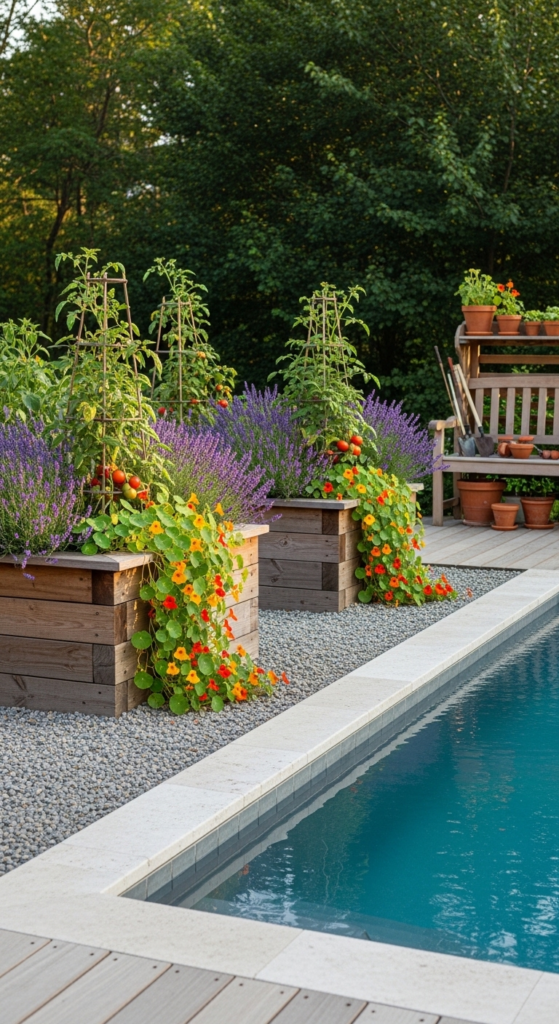 Tomato plants climb small trellises, lavender spills over the bed edges, and bright nasturtiums tumble down toward the pool coping in shades of orange and yellow. A narrow gravel path runs between the beds and the pool edge, and a wooden potting bench at one end holds garden tools, terracotta seed pots, and a vintage watering can. This design is pure farmhouse in the truest sense — it marries beauty and function without apology. Perfect for home cooks, cottage gardeners, and families who want their children to grow up knowing where food comes from.