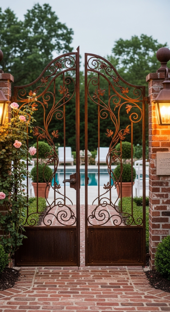 First impressions matter, and this farmhouse pool design delivers one that stops you cold in the most beautiful way. A large pair of custom-forged rusted iron gates — the kind with scrollwork vines and leaf details that look like they’ve guarded this garden for generations — mark the entry to the pool area. The patina of the rusted iron shifts from deep amber to charcoal depending on the light, and no two gates will ever look exactly alike.