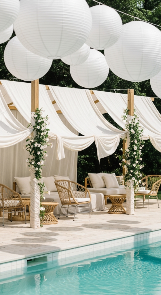 Beneath the canopy, the pool deck is limestone pavers, and the furniture is entirely natural — jute rope chairs, rattan side tables, and linen-covered daybeds. Potted white mandevilla vines climb two of the posts, and a cluster of oversized white paper lanterns adds to the dreamy overhead composition. The pool is a soft teal color with a white tile waterline border. This design is pure poetry — it’s for the dreamers, the aesthetes, and anyone who believes that beauty is its own kind of function. Pair with everything in white, cream, and the softest possible blue.