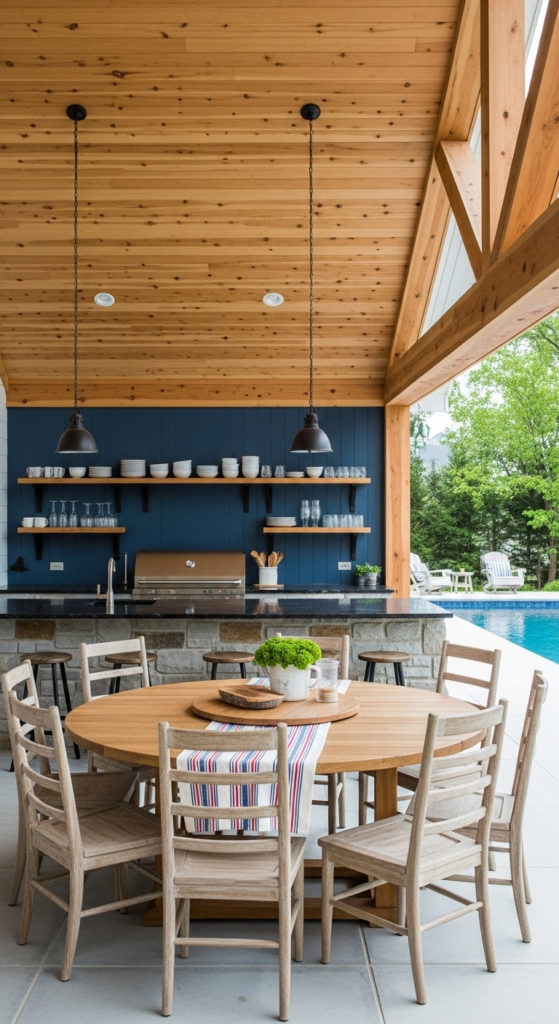 If farmhouse design is about one thing above all else, it’s about gathering — and nothing facilitates gathering better than a full outdoor kitchen built right into the pool area. This design integrates a long stone-clad outdoor kitchen counter and grill station at one end of the pool deck, so the cook is never separated from the conversation or the fun. The counter is topped in honed black granite, the cabinetry below is painted navy blue shiplap, and open shelving above holds stacks of ironstone dishes and Mason jar glasses.