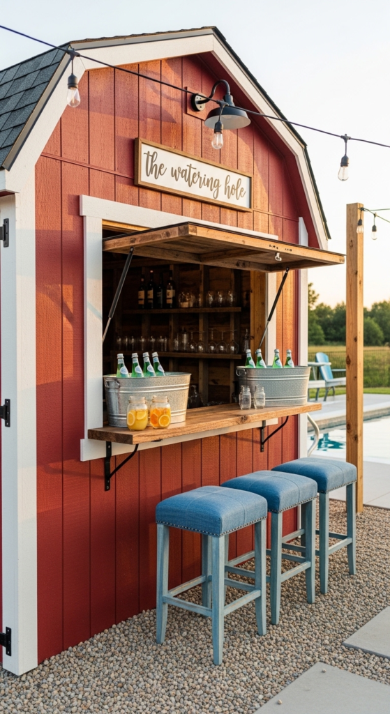 Above the window, a hand-lettered wooden sign reads “the watering hole” or something equally charming. Galvanized metal tubs on the bar shelf hold bottles of sparkling water and fruit-infused agua fresca. A string of vintage-style Edison bulbs runs from the barn eave to a nearby post. The shed sits on a small pea gravel patio separate from the main pool deck, giving it the feel of its own distinct zone. Bar stools upholstered in a faded denim fabric complete the look. Perfect for those who entertain large groups and want to keep drinks and snacks entirely separate from the pool dining area.