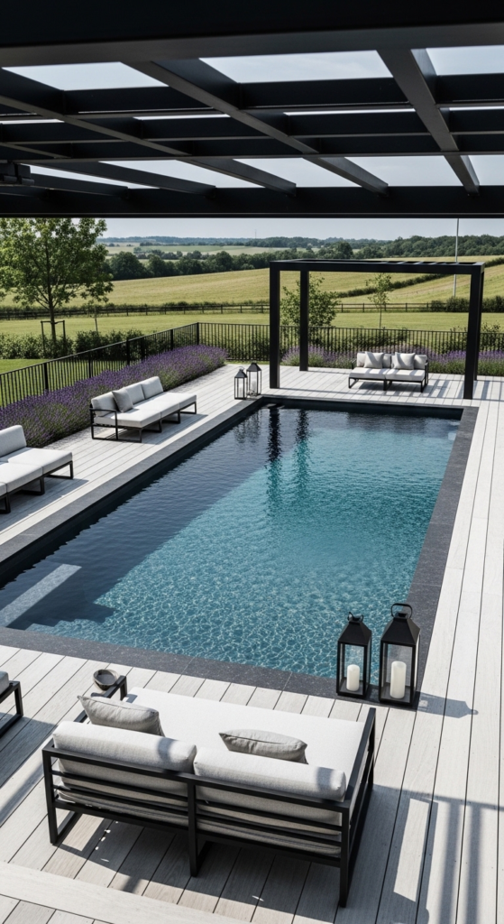 Surrounding the pool is a deck of wide-plank white oak with a weathered gray finish, and the lounge furniture is sleek — black powder-coated steel frames with thick natural linen cushions. A single row of lavender runs along the fence line, and two oversized black lanterns flank the pool steps. The pergola overhead is minimal — just four black steel posts and an open grid of matching steel bars, allowing maximum sky exposure. This is the design for the style-conscious homeowner who wants that editorial, magazine-worthy farmhouse look. Pair with white and black striped cushions and matte black accessories throughout.