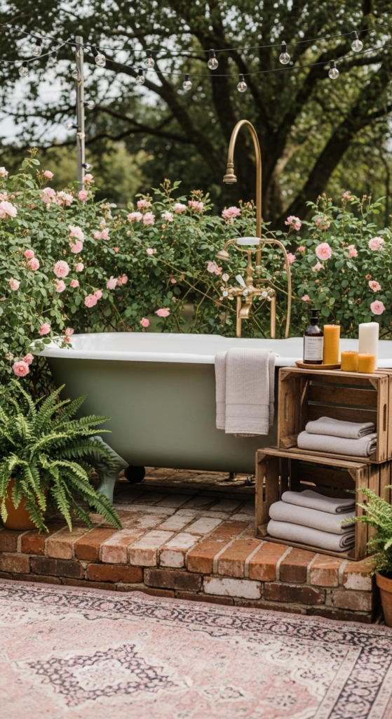 A single antique-style outdoor faucet arcs above it, and wooden crate shelves nearby hold stacks of linen towels, beeswax candles, and bottles of outdoor soap. This corner can function as an outdoor soaking spot beside a larger pool or as a standalone garden feature. String lights overhead and a worn Persian-style outdoor rug underfoot complete the look. It’s perfect for cottage-style homes, hobby gardeners, and anyone who finds deep joy in small, beautifully curated spaces. Pair the color scheme with dusty rose, cream, and aged brass hardware.
