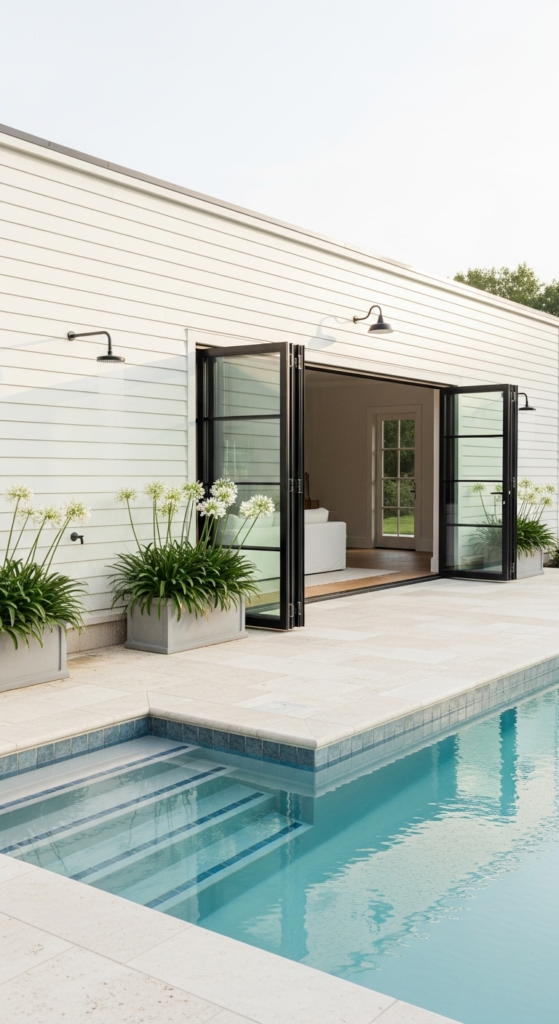 A shiplap accent wall isn’t just for interior living rooms — when carried outdoors as the facade of a pool house or cabana, it becomes one of the most striking farmhouse design statements you can make. Picture a long, low pool house structure clad in horizontal shiplap painted in a warm white or soft greige, with black-framed glass doors that fold open to reveal a breezy changing room and outdoor shower.