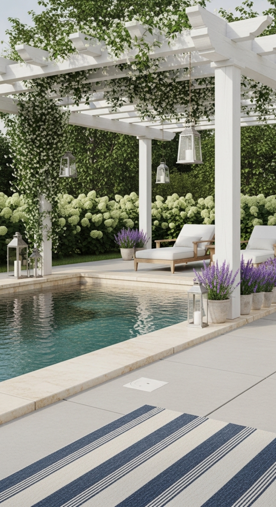 The coping is made of honed limestone in a warm cream tone, and the pool deck is poured concrete with a broom finish that stays cool underfoot even in peak July heat. Hanging galvanized lanterns sway gently from the pergola beams, and a cotton canvas curtain on one side adds a romantic softness. This look is perfect for families who want timeless elegance without fuss. Style it with white linen cushions, potted lavender, and a vintage-style outdoor rug in navy and cream stripes.