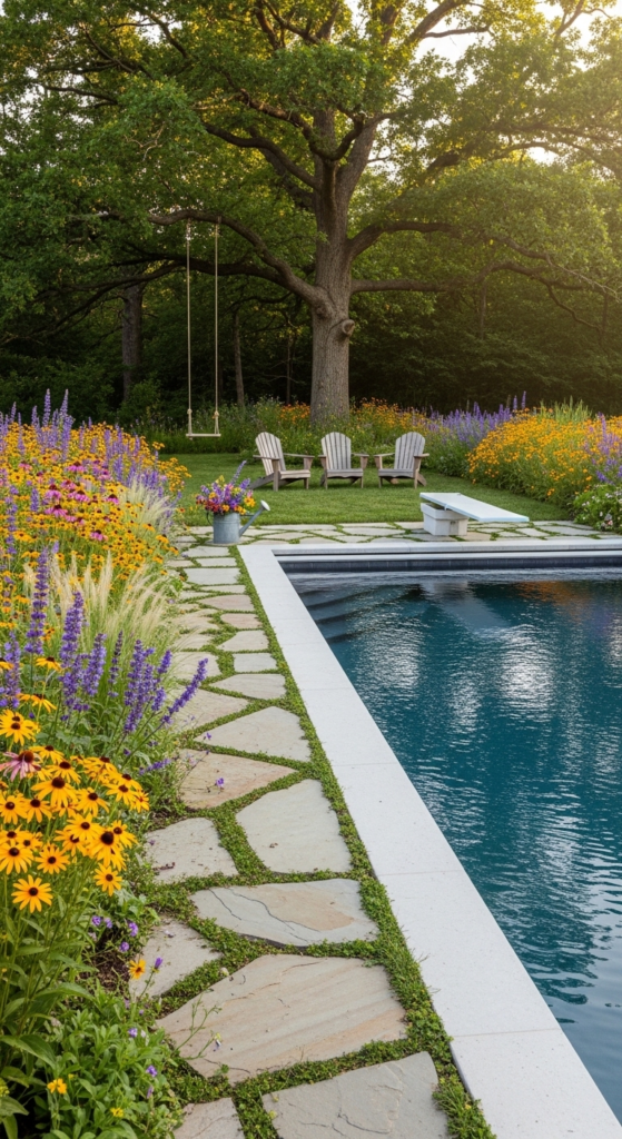Imagine stepping out of a cool pool and into what feels like a wildflower meadow — because in this design, that’s exactly what you do. Rather than a traditional hardscape pool deck, this farmhouse pool is surrounded by a generous border of native wildflowers: black-eyed Susans, purple coneflowers, tall blue sage, and wispy grasses that sway in the breeze. A narrow flagstone path winds from the house to the pool, and the pool coping is simple dry-stack limestone.