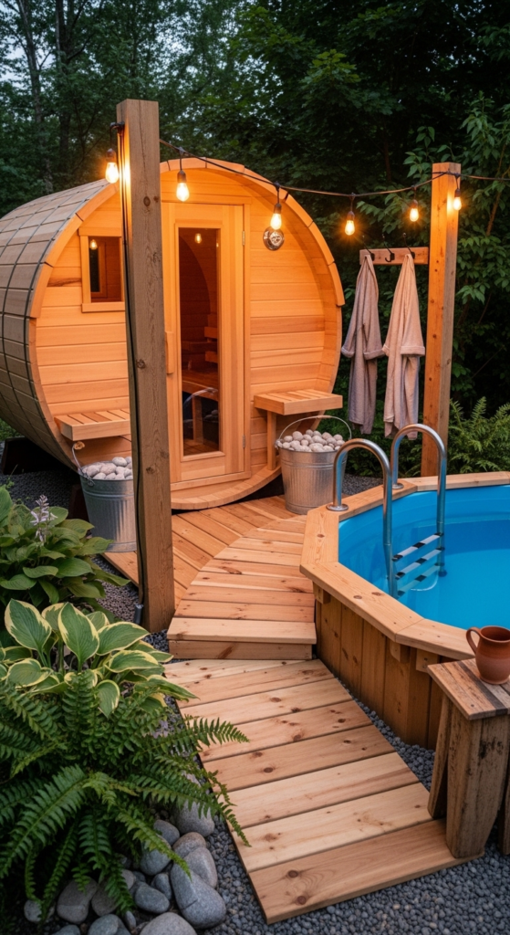 The boardwalk is made of pressure-treated cedar planks with gaps between each one, allowing rainwater to drain naturally. Galvanized metal buckets of river stones flank the sauna door, and a line of cedar posts strung with Edison bulbs creates a warm, intimate glow at dusk. Potted hostas and ferns cluster around the base of the sauna, bringing softness to all those geometric angles. This design is perfect for wellness-focused homeowners and anyone who wants their backyard to serve as a true retreat for body and mind. Pair with linen robes hung on iron hooks and a small side table with a clay mug.