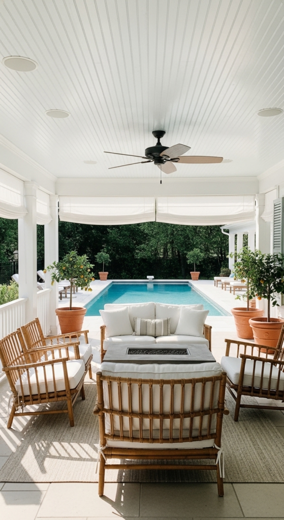 Ceiling fans with rattan blades stir the air, and a full outdoor living room is arranged beneath: a slipcovered loveseat, a rattan coffee table, and a pair of woven chairs around a low fire pit table. Just beyond the posts, the pool shimmers in the open sun. White Roman shades on the outer posts can be pulled down for privacy or shade. Potted citrus trees in terra cotta pots line the edge where covered porch meets open deck. This is the design for those who entertain frequently and want every party to flow naturally between conversation, food, and swimming.