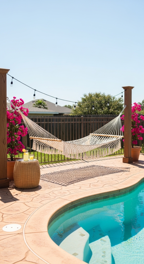 Beneath the hammock, a stack of flat river stones forms a small patio, and a wicker side table holds a sweating glass of lemonade. The pool deck itself is simple stamped concrete in an earthy sand tone, and the pool interior is a warm Caribbean blue that looks almost turquoise in the midday light. Potted bougainvillea in bright fuchsia flanks one post, and a string of globe lights runs between the pool fence and the hammock posts. This design is pure joy — perfect for families and those who want their pool to feel like a permanent vacation.