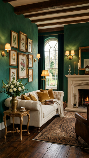 Emerald green walls and antique gold accents make this Victorian farmhouse living room feel quietly extravagant.