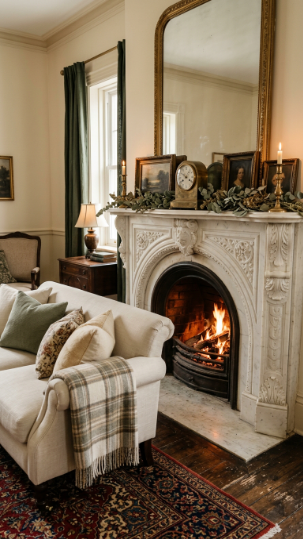 An oversized carved Victorian mantel styled with candles, botanicals, and antiques becomes a room’s entire personality.