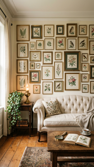 Floor-to-ceiling botanical prints in gilded frames turn the living room into a Victorian naturalist’s paradise.