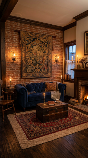 Raw exposed brick paired with a hanging Victorian tapestry creates layered, deeply textured farmhouse drama.