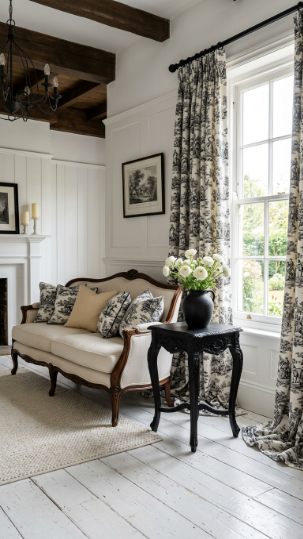 Classic black and white toile fabric on cushions and curtains channels pure Victorian farmhouse sophistication.