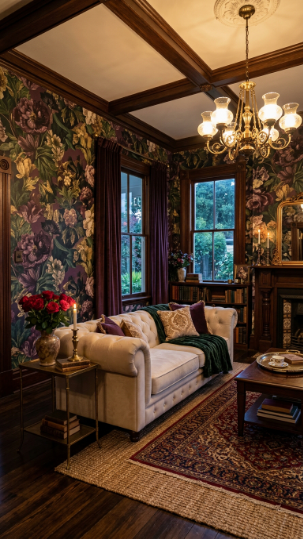 Dark moody floral wallpaper in deep plum and green creates a Victorian living room of pure drama and beauty.