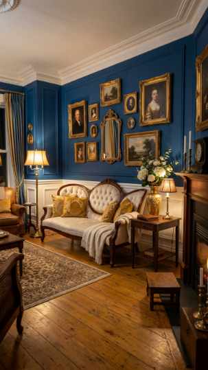 Rich sapphire blue walls with white trim and gold accents make the most breathtaking Victorian farmhouse impression.