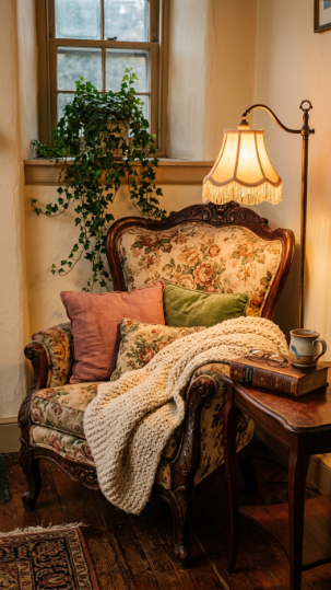 A deeply cushioned Victorian armchair piled with throws and pillows in its own cozy corner is pure heaven.