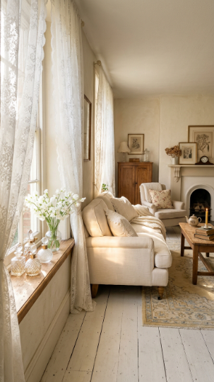 Sheer lace curtains filtering afternoon sun create the most romantic Victorian farmhouse light imaginable.
