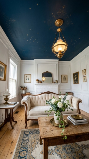 A richly painted ceiling in deep blue or sage above white walls gives the Victorian farmhouse room unexpected drama above.