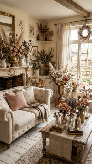 Generous arrangements of dried flowers in antique vessels create breathtaking Victorian farmhouse still-life moments.