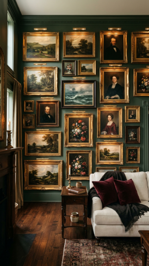 A collection of vintage-style oil paintings in ornate frames transforms a wall into a Victorian farmhouse masterpiece.
