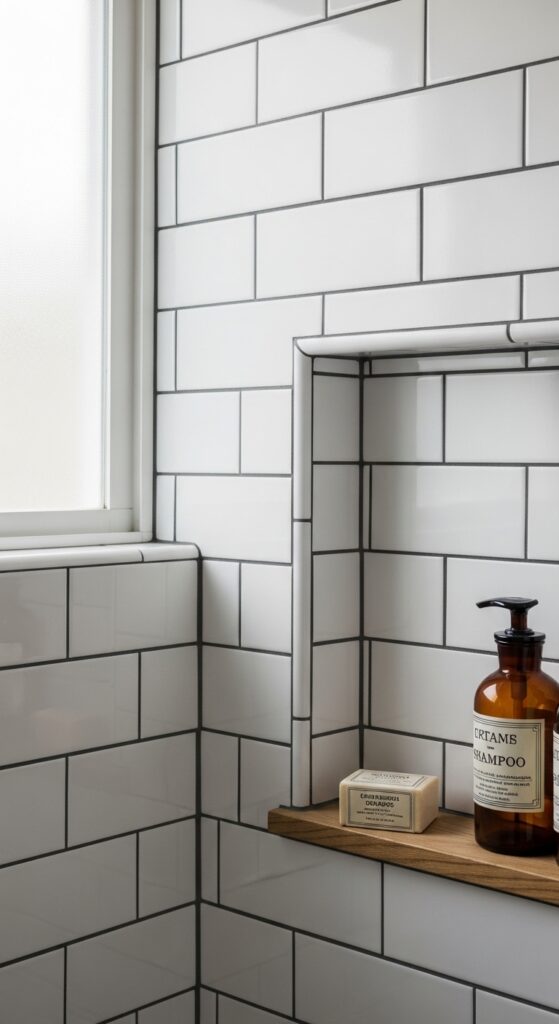 Why it works: Standard subway tile with bright white grout reads clinical. The same tile with dark charcoal grout reads vintage — the difference is entirely in the contrast. Dark grout emphasizes the grid pattern, giving white tile the graphic quality of turn-of-the-century institutional tile. It also hides grime better than white grout (honest, but important). The visual weight of the dark lines creates a structured field that makes even a small shower wall feel finished and deliberate.