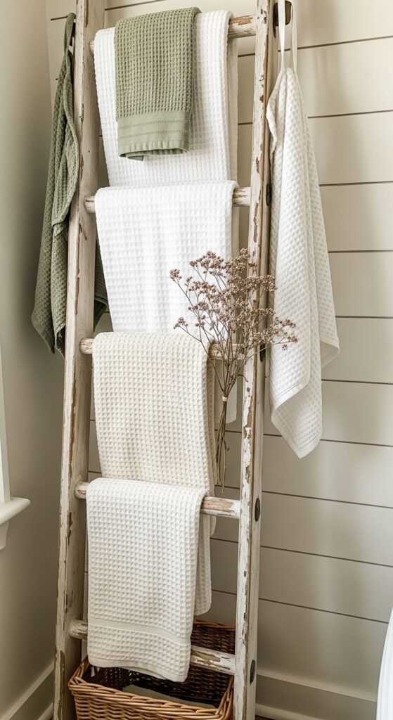 Why it works: A leaning ladder solves a storage problem without adding visual bulk to the walls. It works in corners and against walls without mounting, which makes it ideal for renters. The design principle is purposeful imperfection: a ladder with visible wear — worn edges, chipped paint, slight lean — contributes more character than a pristine piece ever could. Cascading towels at varying heights create organic vertical movement that breaks up a flat wall.
