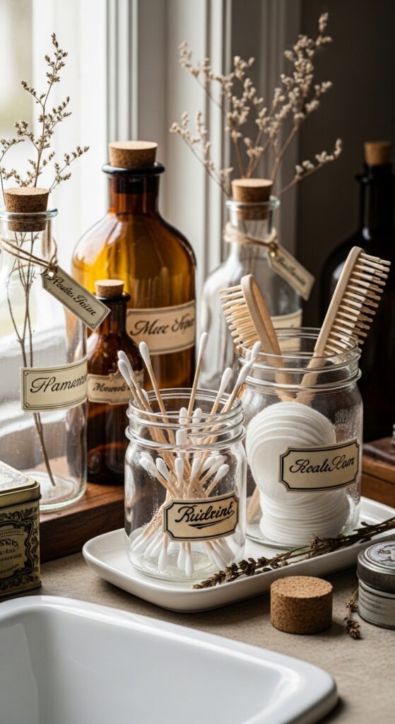 How to get it: Download free vintage apothecary label templates on Etsy ($3–6 for a full set), print on cardstock, and apply to 4-oz and 8-oz wide-mouth mason jars. Seal the labels with a water-resistant Mod Podge formula so they survive bathroom humidity. Style in groups of three to five, varying heights and jar sizes.