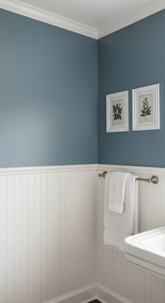 Why it works: An accent wall in a single subdued color creates depth and zoning in a bathroom without the commitment of painting all four walls. Dusty slate blue operates as a visual anchor — it gives the eye a place to rest while allowing all white elements (fixtures, towels, tile) to pop forward. The chalk-finish quality of muted blue reads warmer than a true saturated blue, preventing the space from going cold.