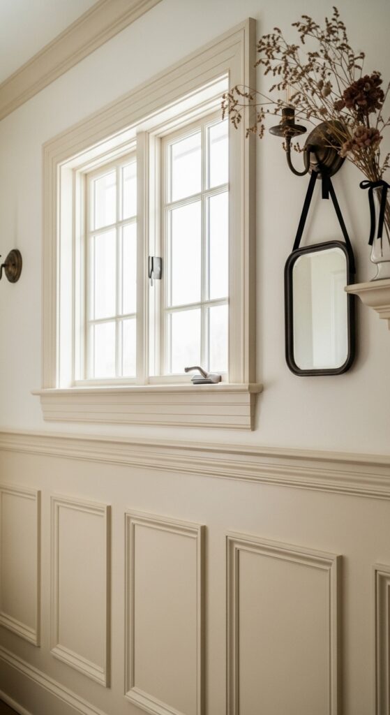 How to get it: Use Farrow & Ball “Mizzle” (No. 266) or a close dupe from Sherwin-Williams for the wainscoting. The key is choosing a sage that reads warm, not cool — if the undertone pulls blue-green, the space will feel clinical. Cap the top of the beadboard with a simple 1×4 pine ledge painted to match, which doubles as display space.
