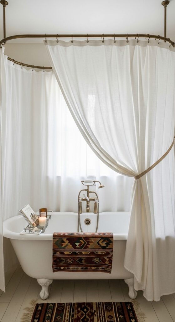 Why it works: A ceiling-mounted oval curtain rod creates a sense of enclosure around a clawfoot tub without walls, which transforms the tub from a standalone fixture into an experience. The design principle is spatial definition through textile: the gathered linen curtain softens the boundary between tub and room, adding warmth and privacy without architectural commitment. Natural undyed linen is ideal because it lets light through in a warm, diffused way that no synthetic fabric replicates.