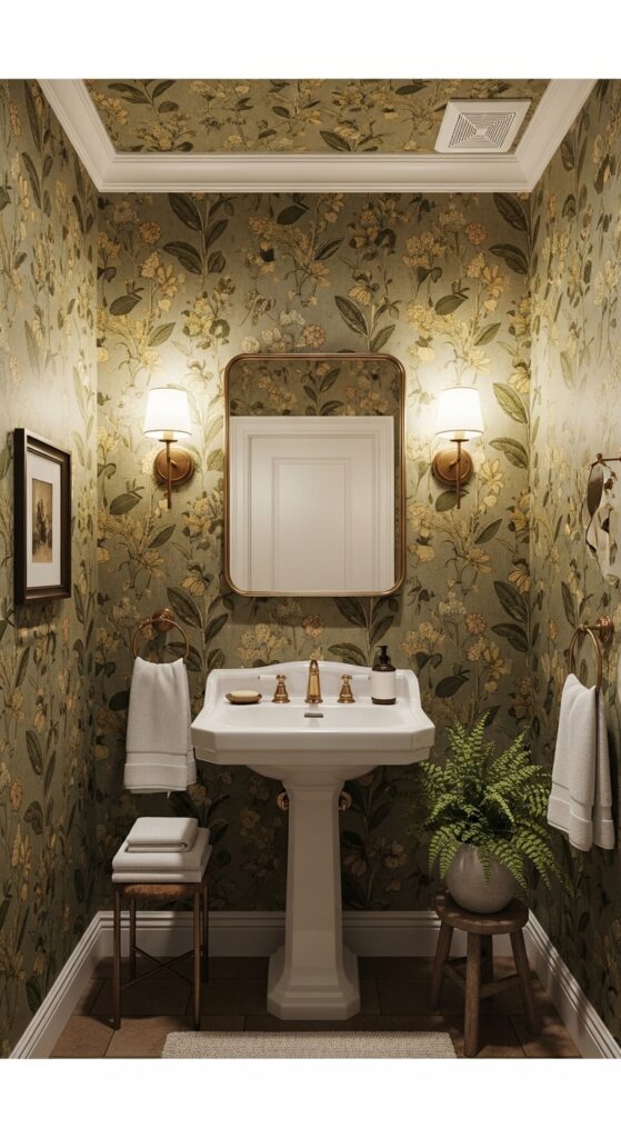 💡 Quick Win: Peel-and-stick removable wallpaper from Chasing Paper or RoomMates in a vintage botanical pattern runs $30–50 for a small powder room — fully reversible for renters.