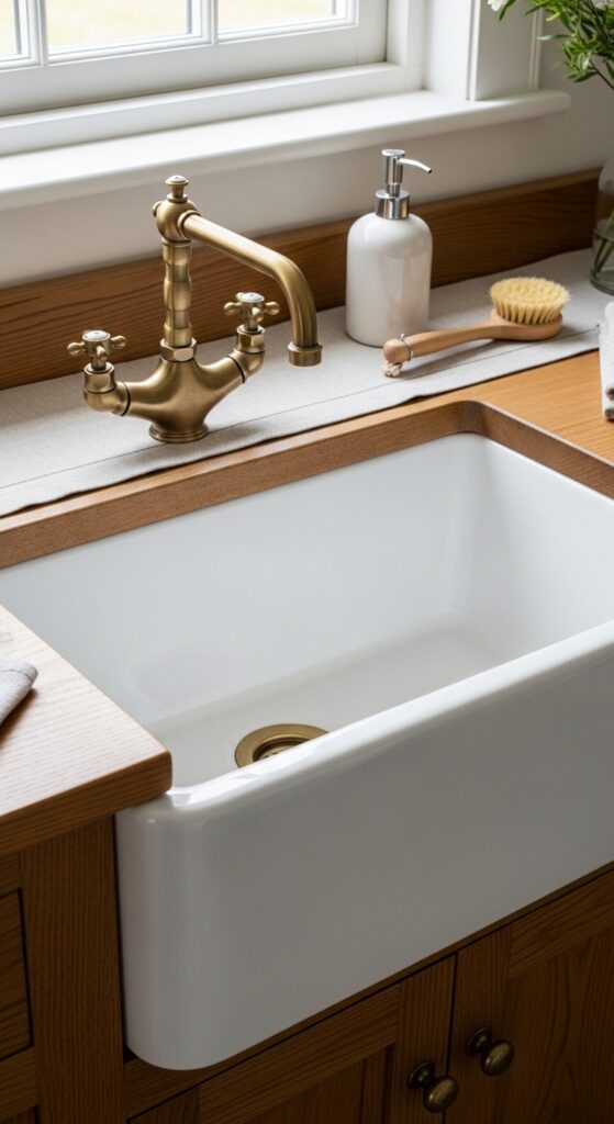 How to get it: Kohler’s “Whitehaven” apron-front sink in cast iron is the benchmark ($900–1,100) but worth the investment — the depth, sound dampening, and porcelain durability are unmatched by acrylic alternatives. Pair with a deck-mount bridge faucet in unlacquered brass from Waterstone or Rohl for a complete vintage farmhouse vanity moment.