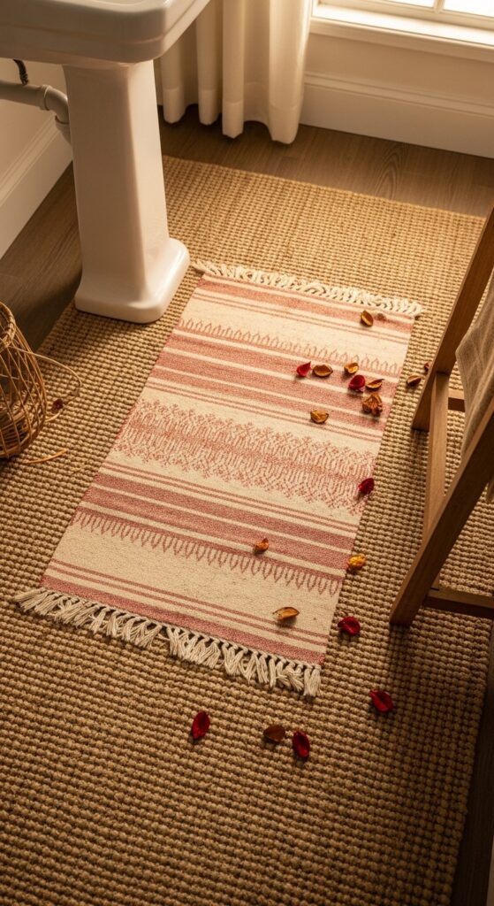 Why it works: Layering rugs in a bathroom is an underused technique that introduces color, pattern, and tactile warmth without any construction. The key design principle is scale contrast: a large-format natural base rug (jute or seagrass) grounds the room while a smaller, more patterned runner adds personality. The base rug expands the visual floor plane; the layered piece draws the eye to a specific zone, typically in front of the vanity.