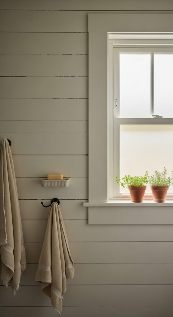 Why it works: Shiplap’s horizontal lines draw the eye across the room, making narrow bathrooms read wider than they are. The slight gap between boards creates shadow lines that add textural depth without adding visual noise. When painted in antique white rather than crisp bright white, the finish absorbs warm light rather than bouncing it — the difference is subtle but unmistakable, shifting the room from sterile to settled.