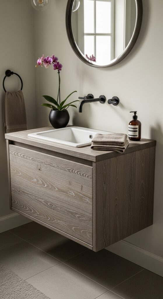 How to get it: IKEA’s “Godmorgon” floating vanity ($299–379) accepts aftermarket wood fronts — Semihandmade offers custom Shaker-style fronts in a grey-washed oak finish that transforms the cabinet entirely. Mount the vanity at 16 inches off the floor rather than the standard 32 inches to maximize the floating visual effect.