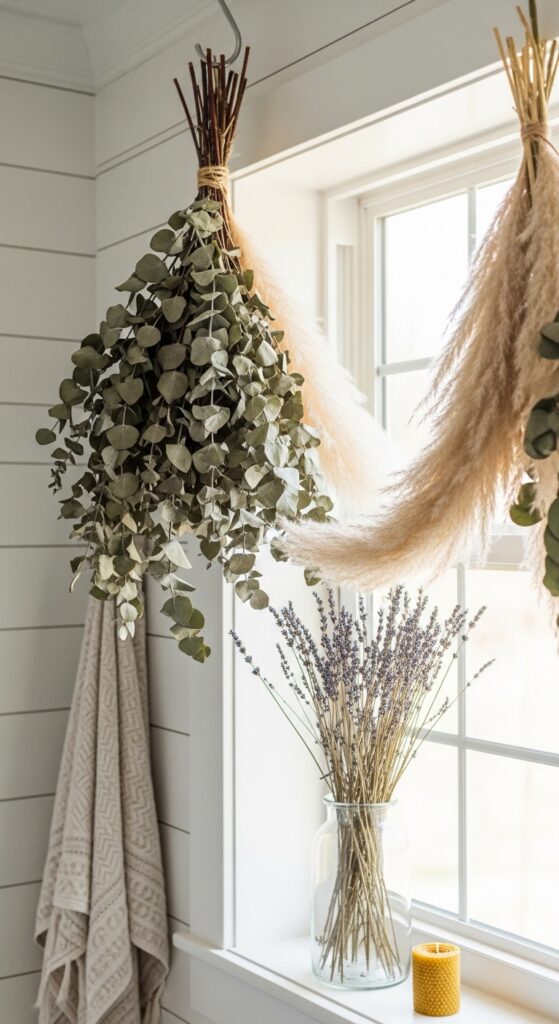 Why it works: Dried botanicals address one of vintage farmhouse’s key design principles: organic imperfection. Unlike fresh flowers (which are symmetrical and controlled), dried eucalyptus, pampas, and lavender have irregular shapes that introduce natural line variation. A bundle hung near a shower benefits from steam humidity, releasing essential oils and remaining supple longer than in dry rooms. The silver-green of eucalyptus complements almost every farmhouse color palette without competing.