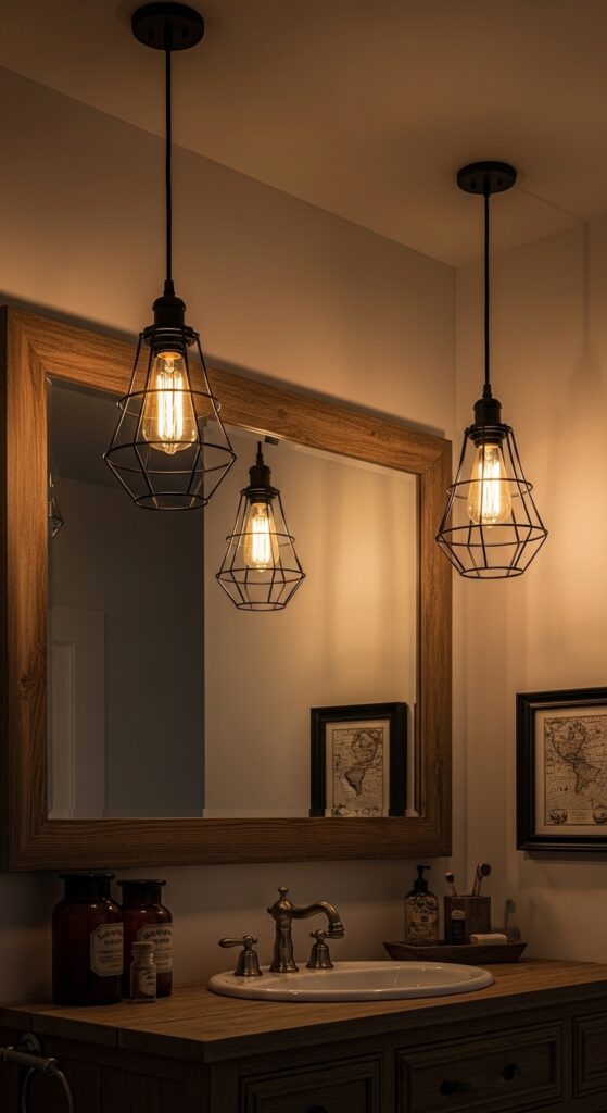 Why it works: Cage pendant lights solve the problem of delivering both ambient and task lighting at mirror height without requiring a vanity bar fixture. The open cage design creates a play of light and shadow on surrounding walls — the grid pattern of the cage casts soft angular lines across the space, adding visual dynamism that solid shade fixtures can’t provide. This works especially well against shiplap, where the shadows echo the plank lines.