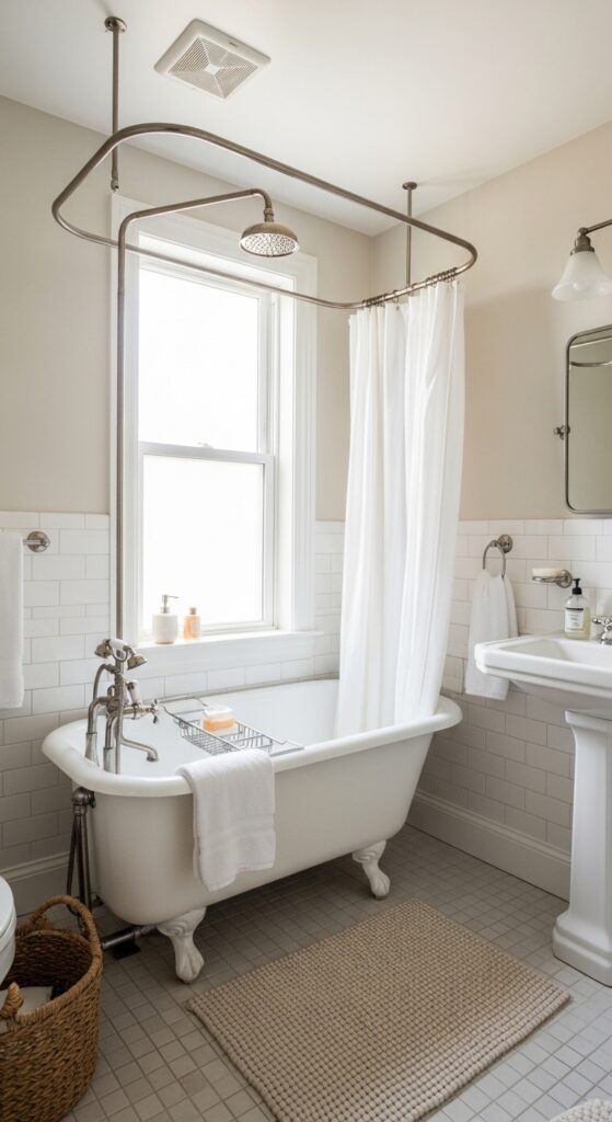 Why it works: Corner placement of a clawfoot tub is a space-planning solution that belongs on every small bathroom shortlist. Installing the tub diagonally in a corner preserves the central floor plane, making the room feel more open than a straight-wall placement. A ceiling-mounted L-shaped curtain rod (rather than an oval rod) accommodates the corner position and maintains the vintage aesthetic. The visual trade-off — gaining floor space — far outweighs the slightly more complex curtain rod installation.