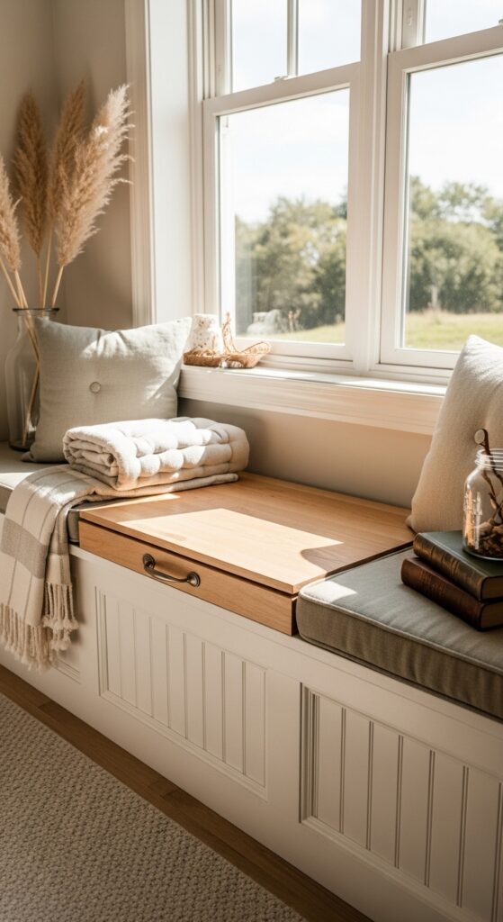 How to get it: Build the bench frame from 3/4″ plywood with a tongue-and-groove pine facing, painted to match your trim color. Hinge the seat top for storage access using heavy-duty piano hinges ($10–15 from hardware stores). Top with a 3-inch foam cushion covered in Sunbrella fabric or indoor-outdoor linen — both handle bathroom humidity and wipe clean. The entire built-in can be completed in a weekend for under $200 in materials.
