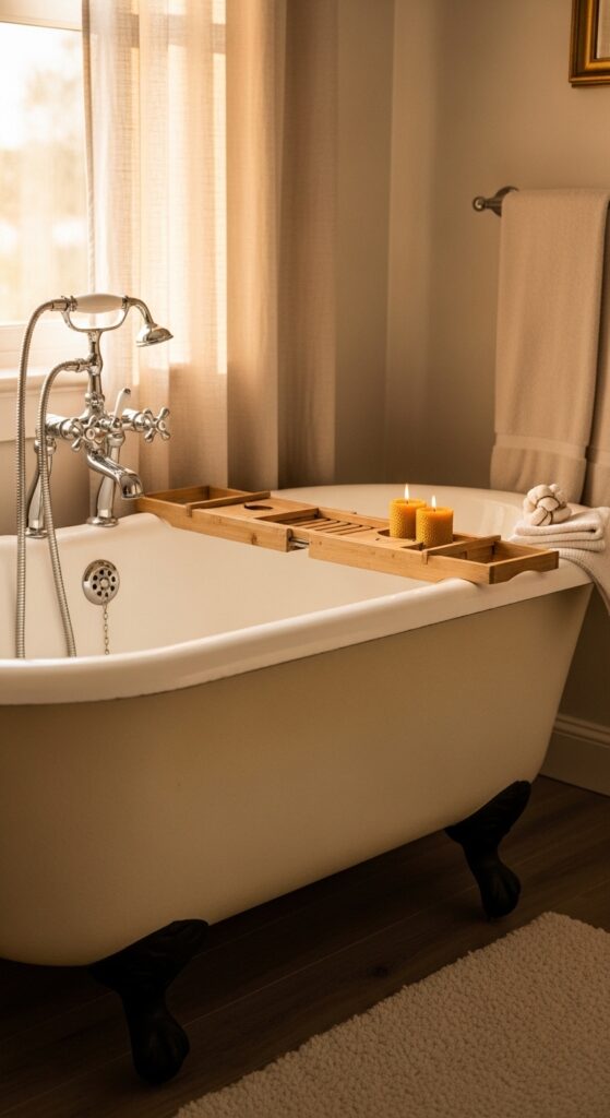 Why it works: A clawfoot tub’s exposed silhouette creates visual weight that anchors a vintage farmhouse bathroom better than any built-in ever could. The floor-to-ceiling visual break created by the tub’s legs gives the illusion of a larger room because you can see floor underneath the fixture — a principle called visual permeability. Original cast iron models hold heat longer than acrylic reproductions, so the experience matches the aesthetic.