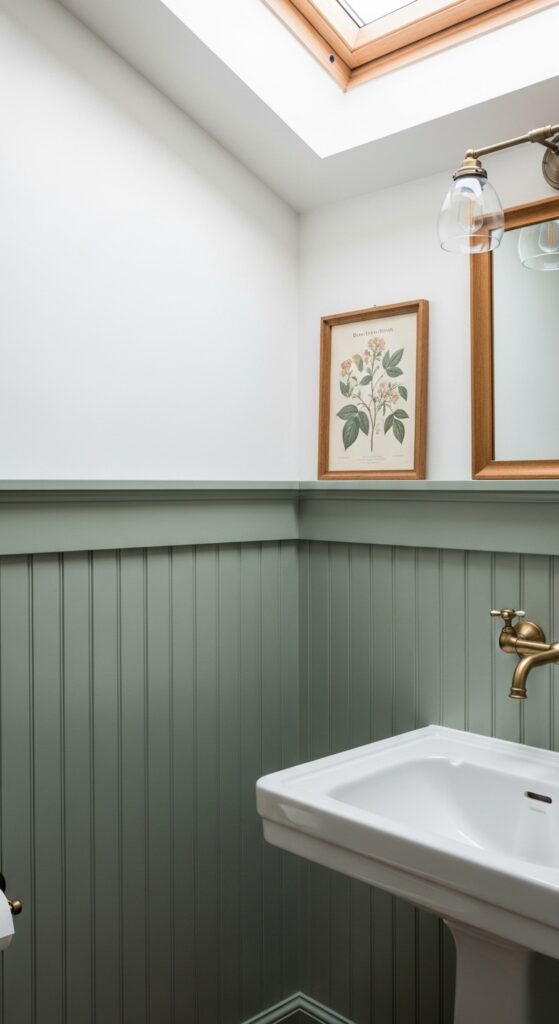Why it works: Beadboard wainscoting solves a classic bathroom problem: moisture. Applied to the lower 36–48 inches of wall (the zone most exposed to water splatter), primed beadboard is both practical and beautiful. The vertical ridges of classic beadboard draw the eye upward, adding perceived height. Painting it in muted sage creates a color-blocking effect that grounds the lower visual field, making the white walls above feel even airier by contrast.