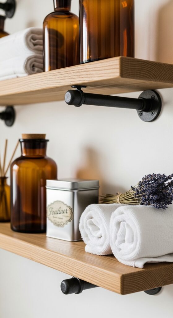 Why it works: Open shelving works in a vintage farmhouse bathroom because the objects themselves become the decor. The design principle at play is visual layering: varying the height, material, and texture of items across the shelf creates compositional interest without clutter. Amber glass bounces warm light; woven cotton adds softness; raw wood grounds the whole arrangement. The combination prevents the shelves from reading as either sparse or overwhelmed.
