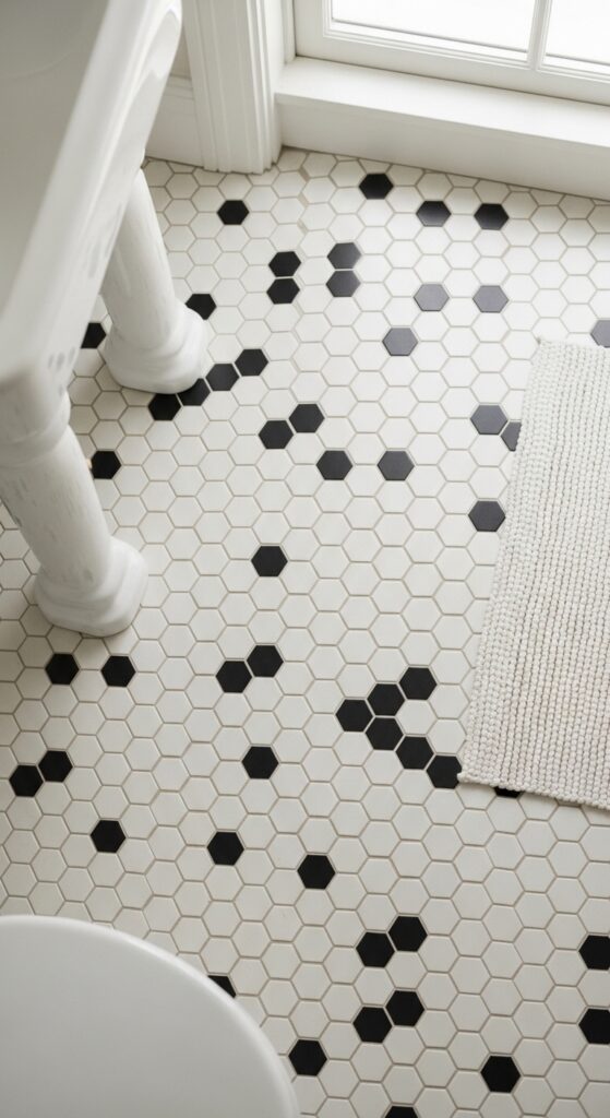 Why it works: Classic 1-inch hexagon mosaic tile is one of the most historically accurate choices for a vintage farmhouse bathroom — it was the standard bathroom floor tile from roughly 1900–1940. The small scale of the hexagons makes any floor size look larger than it is, because the tile’s pattern density creates the illusion of greater surface area. Black and white with warm ivory grout avoids the harshness of bright white grout while preserving the contrast.