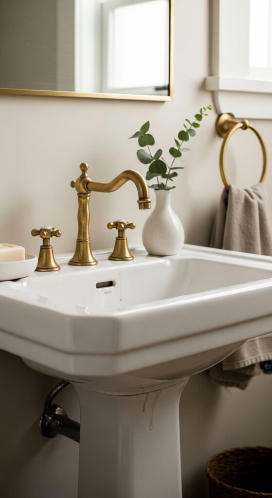 Why it works: A pedestal sink’s exposed base is the opposite of visual weight — the bathroom floor remains visible, which keeps small spaces from feeling boxed in. The design principle is negative space: what you don’t fill is as important as what you do. Aged unlacquered brass hardware is the ideal pairing because it continues to patina over time, deepening in character the longer it lives in your home — a feature, not a flaw.