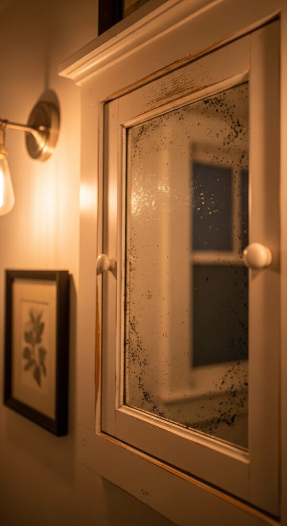 How to get it: Source vintage medicine cabinets at estate sales or Chairish (expect $80–250 for a good one), or DIY by applying a mirror antiquing spray to the back of float glass in a new cabinet frame. The spray is available from Rustoleum for under $12 and creates a convincing foxed effect in under an hour.