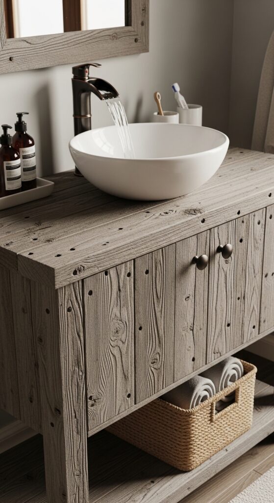 Why it works: Reclaimed barn wood carries natural pattern variation — knots, nail holes, grain changes — that gives the vanity visual interest without added decoration. The contrast principle at work here is textural: rough-grain weathered wood against a smooth porcelain vessel sink creates a tension that holds the eye. That tactile contrast is what makes the combination feel considered rather than accidental.