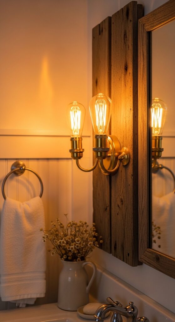 How to get it: Replace any existing bathroom light fixture with wall sconces mounted at eye level (60–66 inches from floor) on either side of the mirror rather than overhead. Overhead lighting casts unflattering downward shadows. Pair with Philips’ vintage ST64 filament bulbs in 2200K for maximum warmth — they’re $12–18 per bulb and available at most hardware stores.