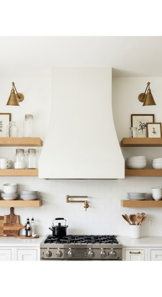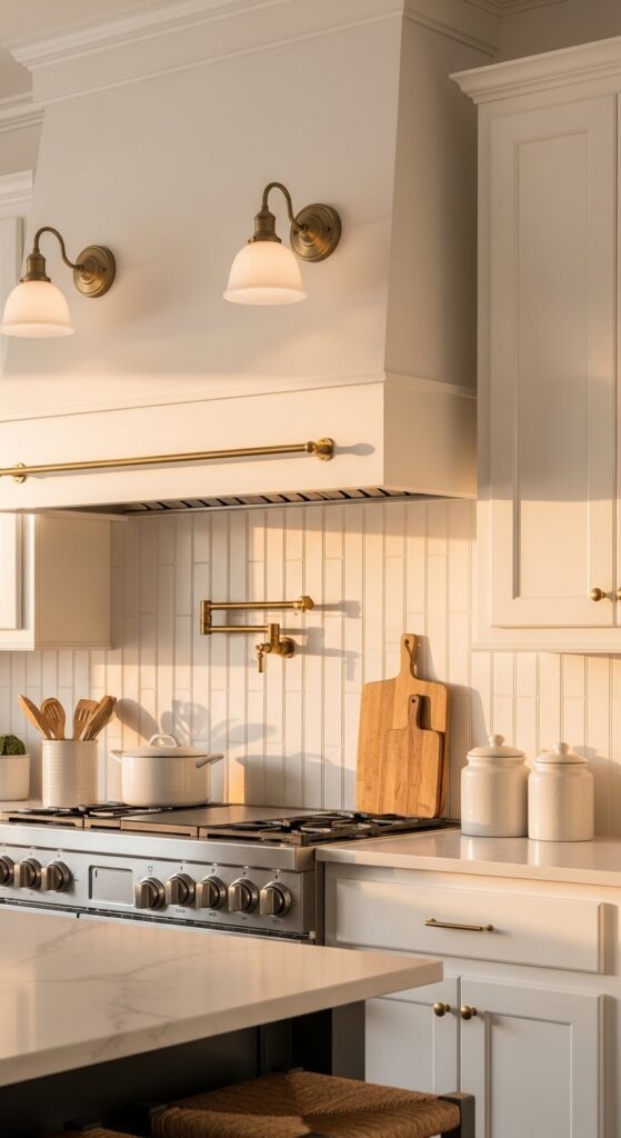 How to get it: Install sconces roughly 28 to 34 inches apart, depending on hood width, and use 2700K bulbs for a mellow glow. This works best when the hood wall has enough breathing room and isn’t crowded by too many uppers.