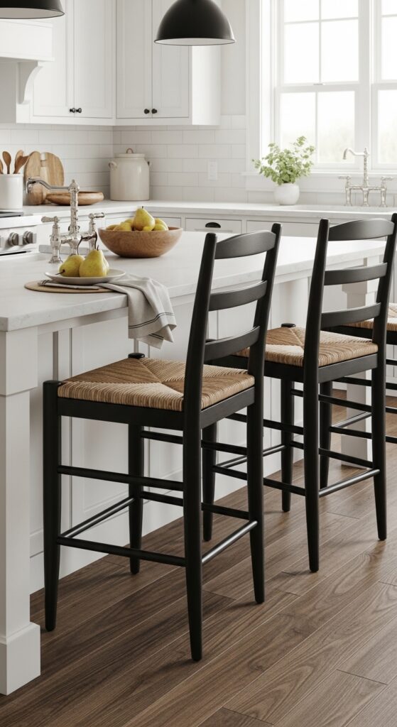 💡 Quick Win: One pair of rush-seat counter stools can shift the tone of a kitchen even before you touch the cabinets.